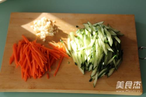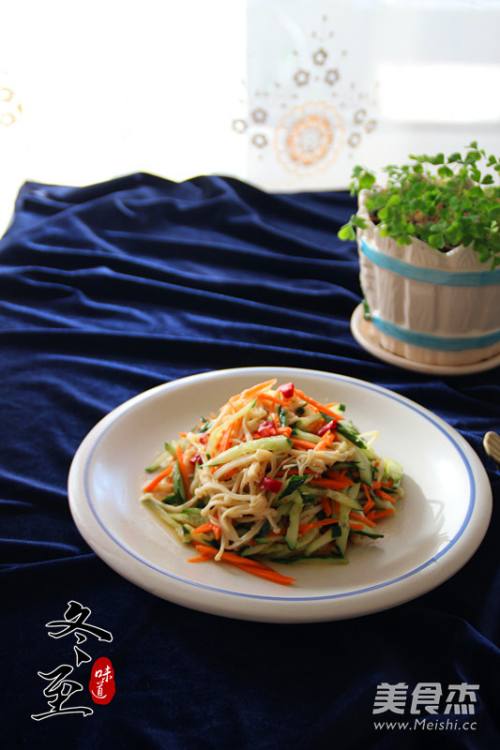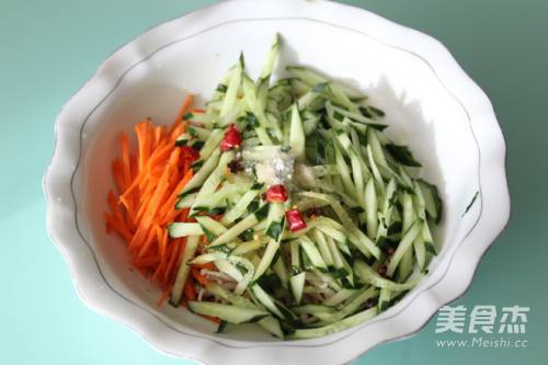 6将黄瓜丝,胡萝卜丝和金针菇放在大碗内,加入辣椒油,花椒油,蒜末,盐,白糖,米醋,酱油