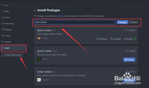 那么如何编译写的脚本语言呢,在设置里面,我们需要安装个插件叫做“Atom Runner”,这里小编已经安装好了