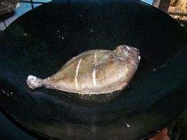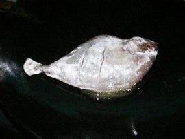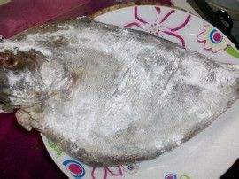 2鱼处理后,鱼身上稍微切两刀洗净控干水。抹上一层薄面粉。