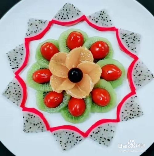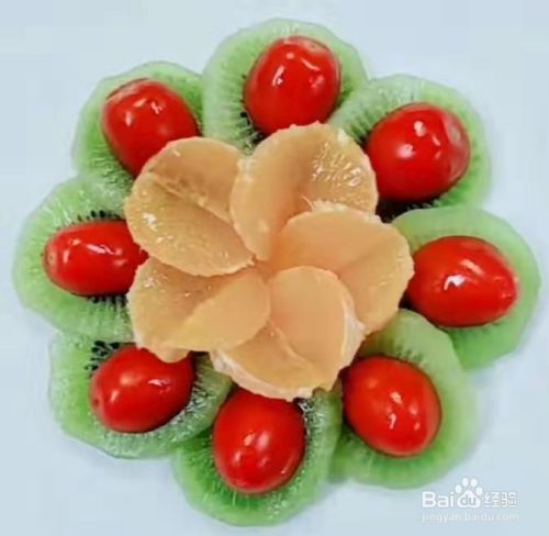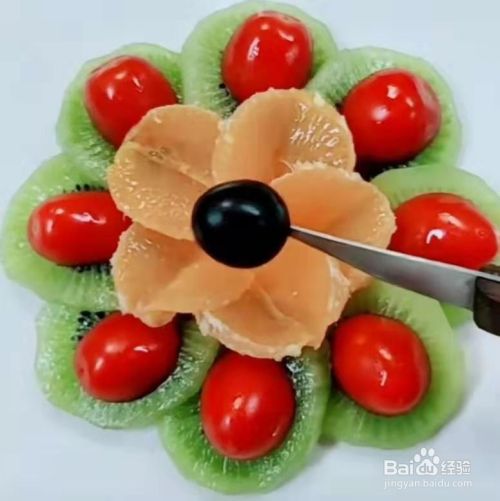 把桔子掰成小瓣,用刀对半切开,不要切断哟,如下图摆放在猕猴桃上面。见下图