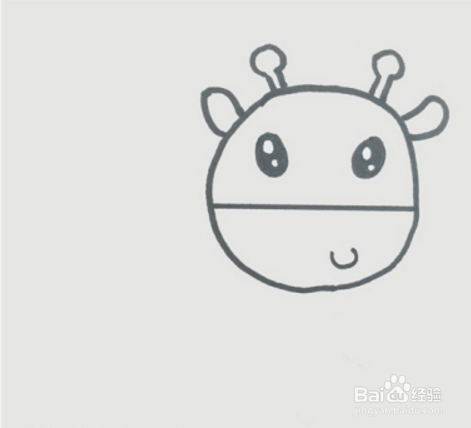 接着,在圆的上方画两个短短的鹿角,鹿角顶端是圆形的,在旁边画上椭圆形的耳朵,圆的上半部分画两只眼睛,下半部分画一个歪着的嘴巴。
