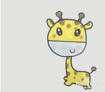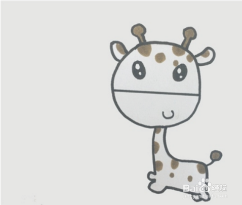 继续画出一个圆圆的尾巴,在鹿角、耳朵边缘和尾部用棕色涂满,在小鹿身上和额头位置也涂上棕色的斑纹。