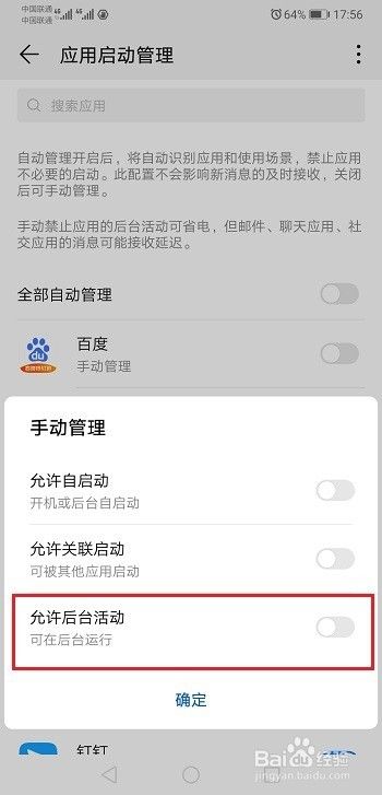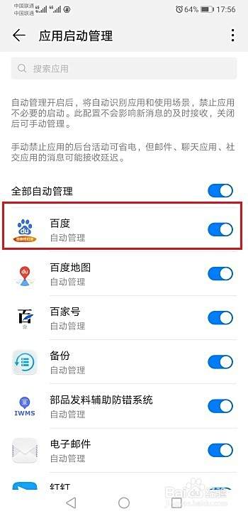 第三步进去应用启动管理界面,可以看到默认全部应用都是自动管理,选择要设置后台运行的应用,关闭自动管理,选择手动管理,如下图所示: