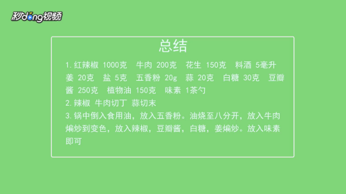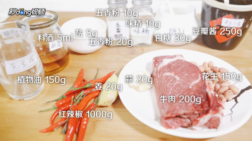 准备食材:植物油、料酒、红辣椒、牛肉、姜、盐、五香粉、蒜、花生、豆瓣酱、白糖、味精。