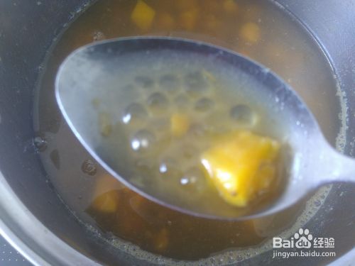 加西米进去,西米要一点点地撒进去,然后用勺子搅拌。