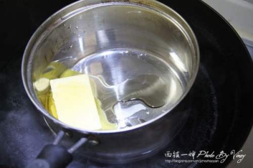 5黄油和蜂蜜倒入奶锅,然后隔水加热至全部溶化,搅拌均匀。