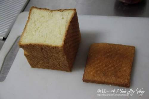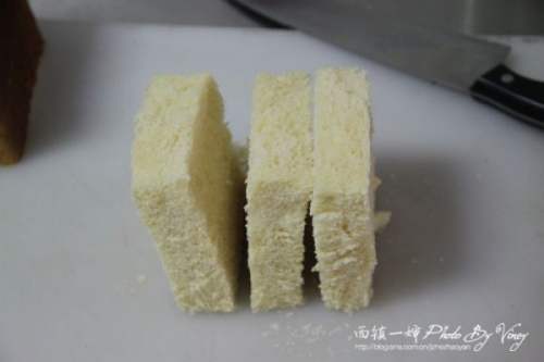1取2/3的吐司。我是自己烤的吐司,如果你去外面买,要记得买还未切成块的那种大吐司。然后将吐司的两个厚底边都切掉,留出底部的那个放一边备用。
