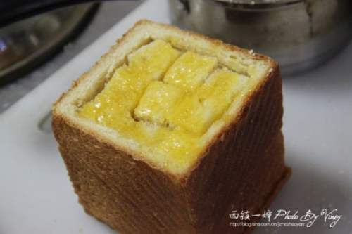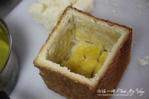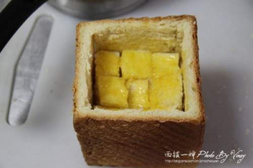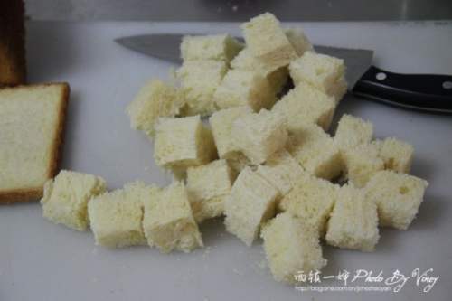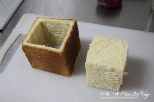 3挖出的面包芯儿先横着切三片。(我是竖着切得)
