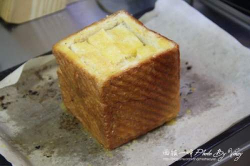 9将吐司移到铺了油纸的烤盘上之后,四边和外壁再刷一层黄油蜂蜜。放进预热170度的烤箱中下层,15分钟即可。