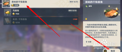 找到美味的干烧香鱼并点击,再点击右下方的购买选项,即可获得美味的干烧香鱼。