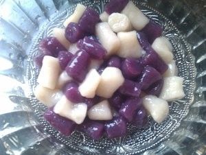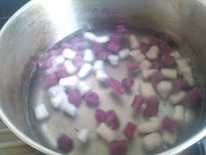 放入锅中煮开,3-4分钟就好了,判断熟没熟的方法就是,水开后,芋圆飘上来,那就好了。煮过芋圆的水,会变成紫蓝色,因为紫薯里面含有花青素的缘故。
