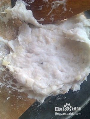 为了成品比较Q,先用3-4勺滚开水,加入100g木薯粉,搅拌成糊状,如果有多余的粉没有成糊也不要紧,再加入到芋头泥中,慢慢揉成面团状,这个过程很凶残,各位最好带着手套做,揉的过程中,芋头会不断的出水,要有点耐心,要是觉得很稀,面不成团,可以在途中一点点加粉,一点要少量,慢慢的加。