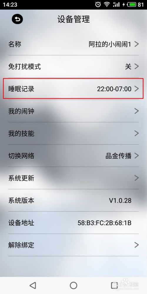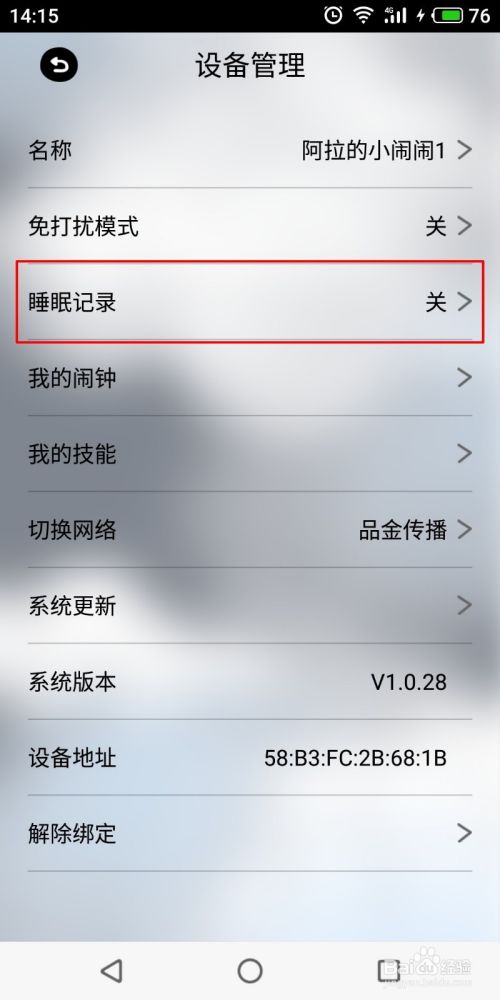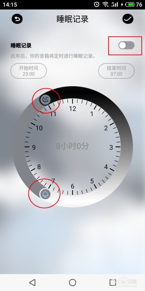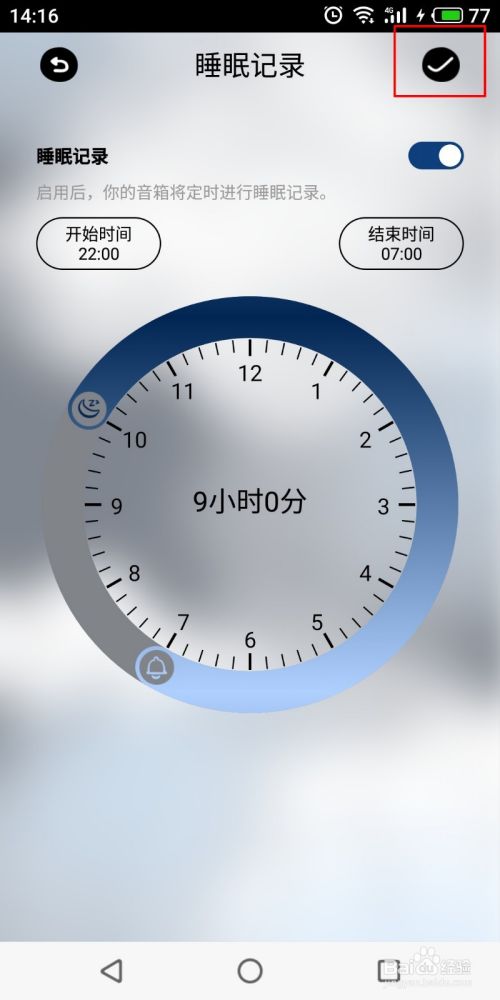 返回上一页面,可看到“睡眠记录”的开关已经打开,并显示了开始时间和结束时间。在你睡觉的时候,阿拉的神奇小闹闹会对你的睡眠进行监测。如果半夜里你说了梦话或者打了呼噜,早晨起床的时候,小闹闹会以播放你打的呼噜或者梦话的方式作为闹钟铃声提醒你起床,非常有趣。
