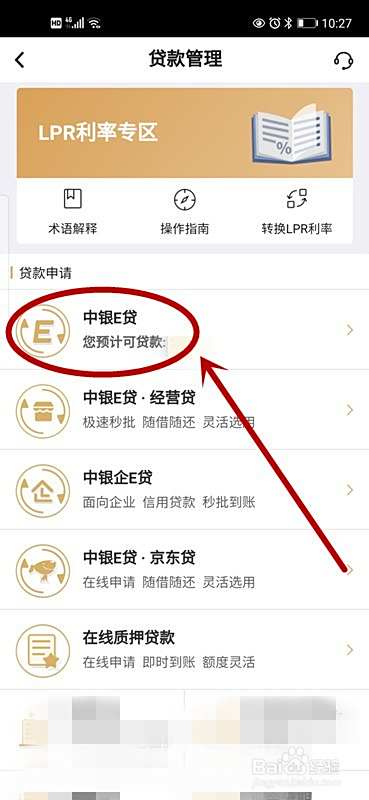贷款管理界面,点击“中银e贷”进入。