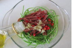 烧锅开水,加入少许盐和几滴油,放入蒜薹进去焯煮。