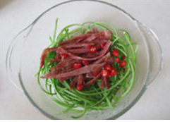 培根拌蒜薹这款简单快手的凉拌菜,蒜薹焯熟后撕成条与培根再混合在一起凉拌。 拌好的成品色泽漂亮,香气浓郁、营养丰富、鲜美可口。这菜制作起来虽然很简单,但也有窍门哟,两种食材的前期处理很重要,培根要先煎一下,才能更激发其香味。 而蒜薹呢,焯煮后要放入凉开水中过一下能保持蒜薹的脆嫩,你是不是掌握了呢?下面就来看看详细的制作方法吧。