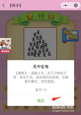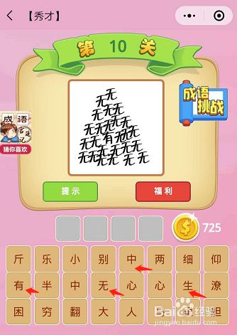第十关的图片上是很多个无字,围绕着一个有字,那么这一关的成语,小伙伴们已经猜到了吧,对就是无中生有。
