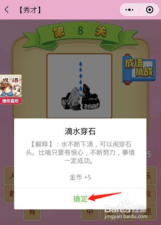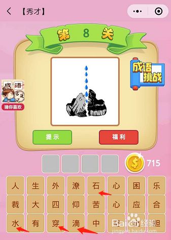 第八关的图片上是一个滴水把石头滴穿了,所以这一关的难度也不是很大,滴水穿石。