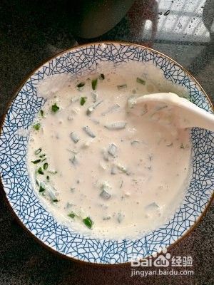 把葱切末,倒进米浆里,加盐。(可以放瘦肉,也可以是海蛎。)油饼的咸淡可以根据自己口味添加。