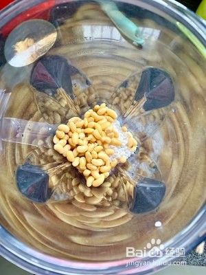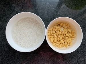 洗净,沥干。大米和黄豆都倒入料理机里。