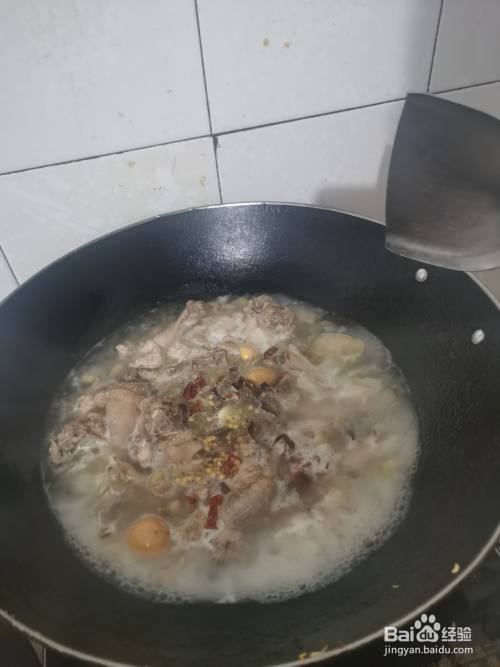 铁锅洗净加油倒入压力锅中的老鸡肉、黄豆、干辣椒炒拌几分钟,加入锅中的鸡汤和盐煮开几分钟,最后拍入蒜米拌匀隔一阵子就成了。