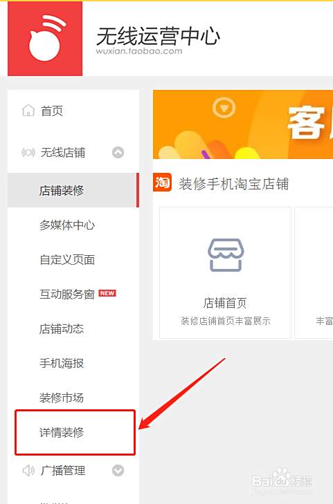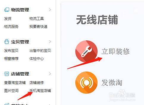 用电脑进入卖家中心后台,左侧栏里点手机淘宝店铺,然后点立即装修
