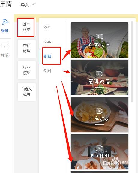 进入编辑页面,左侧栏里有很多选项,点基础模块里面,有个视频选项,点那个添加视频,视频不同类目是不一样的。如果之前没有上传过视频,那么现在可以直接上传,点击上传视频,视频不宜过长,而且尺寸注意看看符不符合,如果不符合会提示。上传后会先审核,过几分钟点刷新页面,添加审核过的视频,然后编辑下标题,就可以直接发布了!