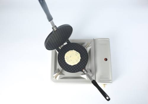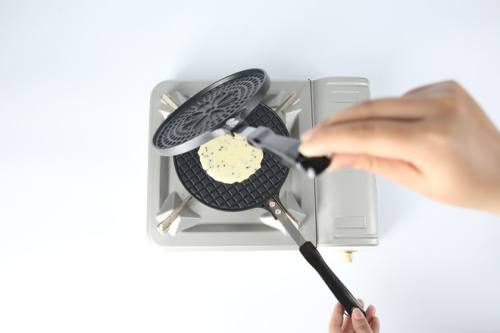 3将蛋卷模放在明火上加热,加热到一定温度(手放在模具上感受到温热即可)
