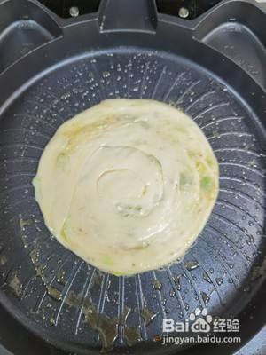 电饼铛选择葱油饼功能,进入预热。预热好,放入食材,饼胚的上面涂抹一层油,锁住水分,中间翻面。