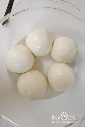 300克面,3克盐,100克开水,80克冷水,搅拌成面絮,不留干粉,水量偏大柔软,揉面成团。(我用的厨师机) 揉好的面团是500克,我分成了5份。表面抹油,松弛20-30分钟。我放在了玻璃碗里,你也可以盖上保鲜膜。