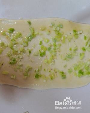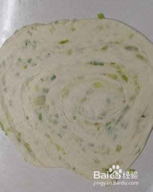 面团不用揉,面板抹油,面团擀成长方形面片,均匀涂抹油酥,撒葱花。折成3折,向中间折叠,再向中间对折,拉长,卷起,收尾巴,压扁。松弛,擀平成大饼。