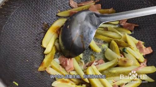先把准备好的配菜切好,火腿放入锅中翻炒均匀后加入黄瓜,加入适量的配料,翻炒均匀后即可出锅。