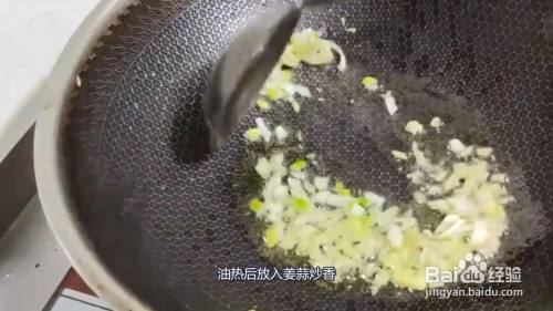 锅中加入适量的油,油热后放入姜蒜炒香,炒香后放入切好的火腿。
