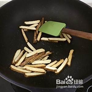 大火热锅,加食用油,加入香干炒,放一点点生抽,别放多了。炒一分钟左右。