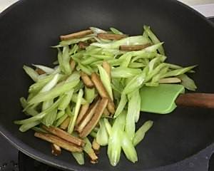 保持大火,倒入芹菜片,略炒,加一点点糖,适量盐,再炒一小会,即可出锅。