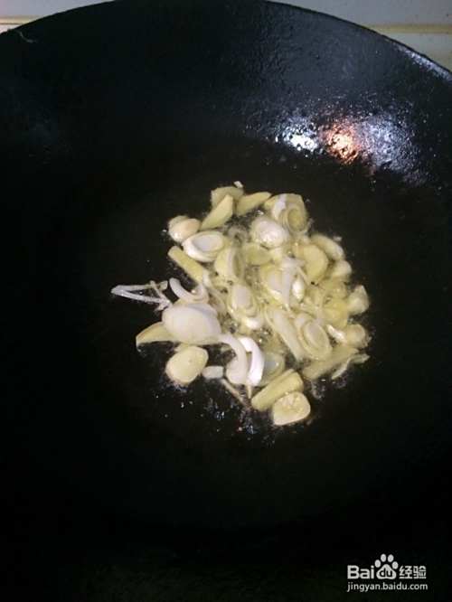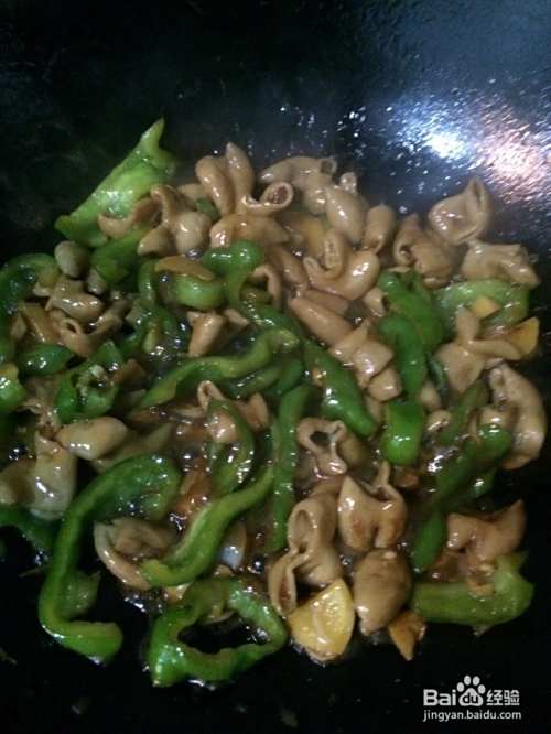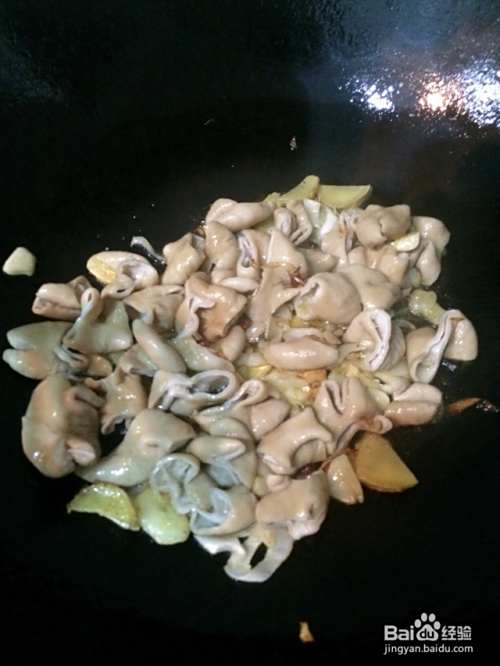 倒入肥肠,大火翻炒,烹入料酒炒一会