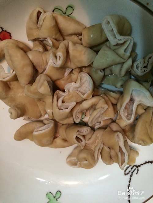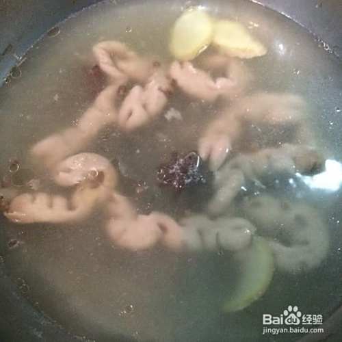 煮好的肠切成段肥肠用水里加白醋泡,把肠子里面翻过来,撕掉里面的肥油和筋膜,反复洗干净。水烧开,加入料酒、花椒、八角,一点盐、姜片,小火煮肥肠至8层熟,大概要30分钟
