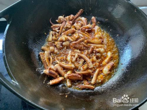 等酱料的香味炒出来之后,加入处理好的鱿鱼须下锅,一起加入的还有姜蒜,转大火,一直爆炒出香味。