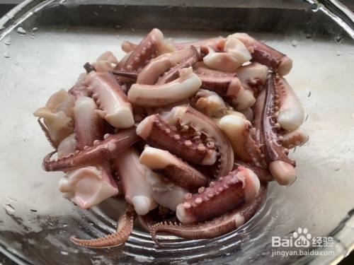 先来处理食材,鱿鱼头清洗干净,用力搓洗表面,然后加入一勺料酒,搅拌均匀腌制半小时备用,去除腥味。
