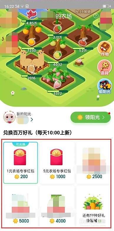 天猫农场和其他软件里的农场一样,都是种植植物的,不同的是他们收获物不一样。天猫农场植物收获的是太阳,而这个太阳是可以换,购物红包以及商品。每个换购物品下都标出了,太阳的换购数量。达到数量就可以兑换了。