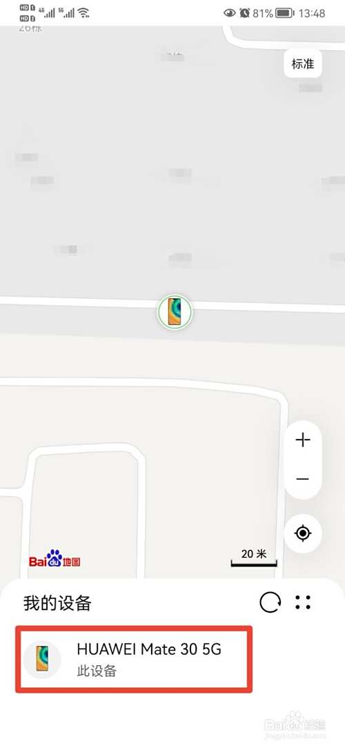 在另一台华为手机上打开查找设备APP,登陆丢失手机的华为账号,选择需要定位的手机设备名称,点击定位设备即可远程定位并在地图上查看设备位。