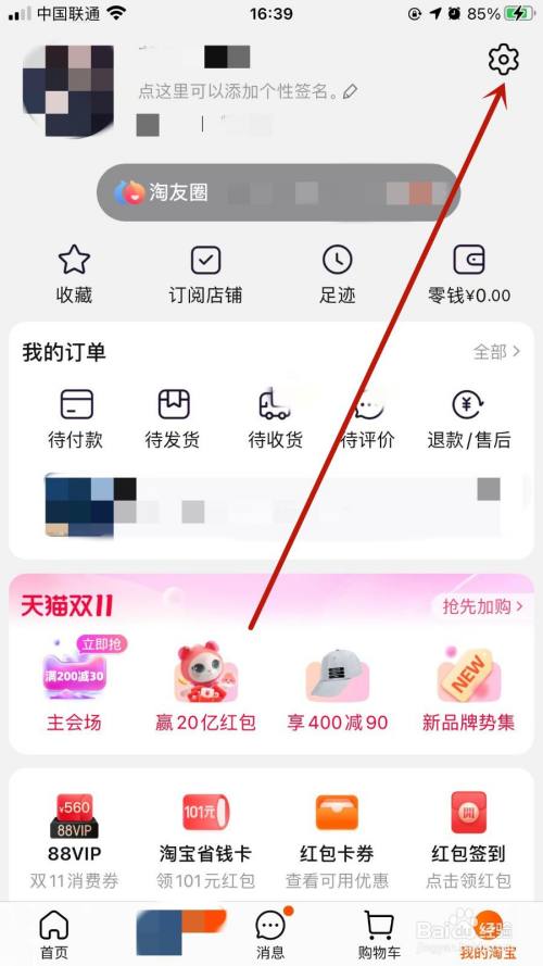 2:点击进入淘宝首页点击我的页面然后点击右上角的设置按钮