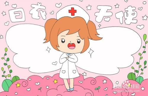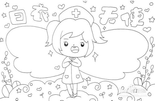 首先在中间画一个白衣天使,先画出小护士的基本轮廓,再画出人物头顶上的护士帽,最后给她加上一双大翅膀,再在上方画出报头文字“白衣天使”。