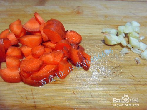 胡萝卜洗好,切成小块,大蒜切成蒜末。