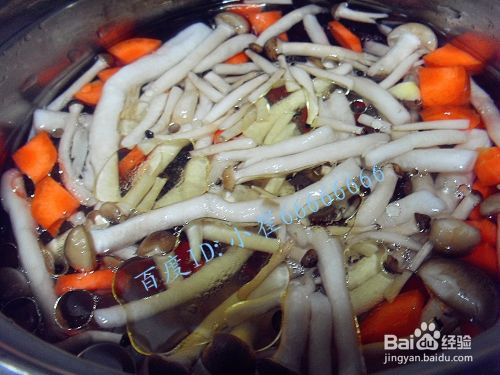 锅里倒入适量的玉米油炸锅,然后倒入适量的清水,加入准备好的海鲜菇和胡萝卜块,继续加热。
