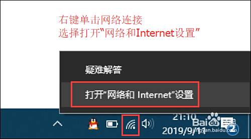 首先右键单击桌面右下角的无线WIFI图标,单击“打开网络和Internet设置”
