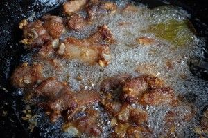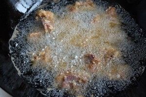 热油锅,油烧至6成热,下排骨炸制,小火慢炸,油稍多,要把排骨完全淹没。