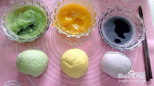 紫甘蓝,芹菜用料理机榨汁。南瓜切片蒸熟,冷却后加两勺水放料理机打成泥。分别把三种材料与面粉混合,揉成面团至面团表面光滑且不粘手