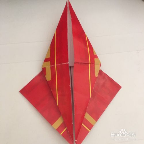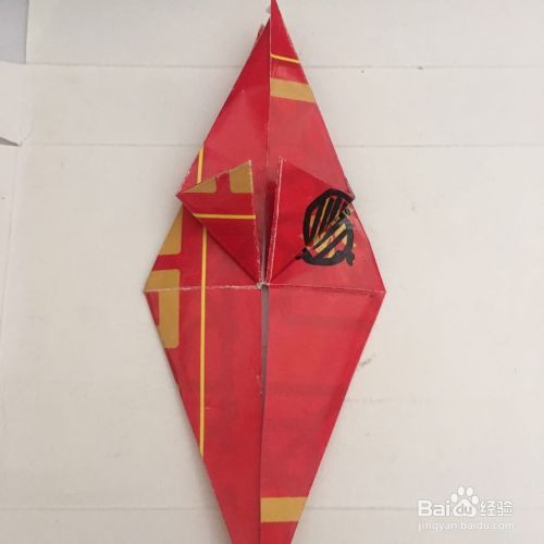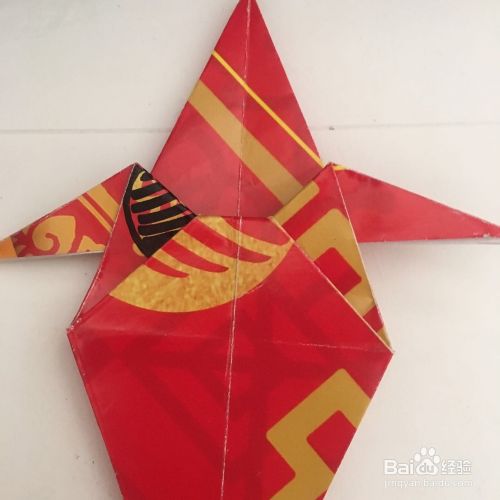 第四步 折叠完之后左右翻过来 把上方两个长角都向外平行折叠 同时再把当中三角形的尖角向下折进背面