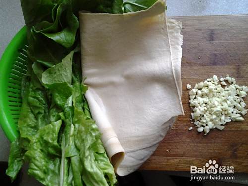 莴笋叶和豆腐皮洗净控水,蒜瓣剥去蒜衣切碎。
